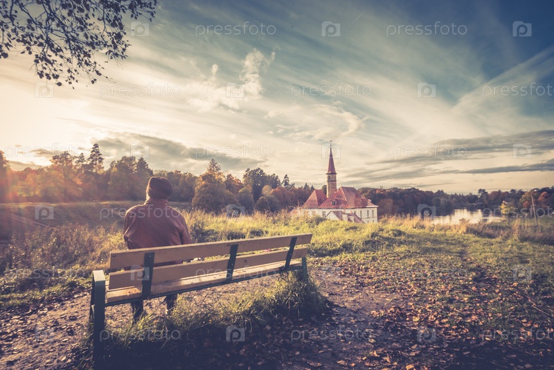Пожилая женщина отдыхает, сидя на скамейке в осеннем парке. Вид сзади