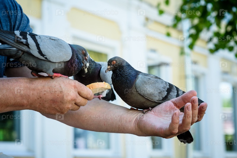 Серые голуби едят из рук человека