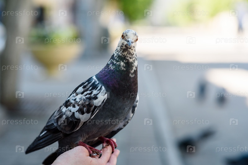 Пятнистый голубь крупным планом сидит на руке человека