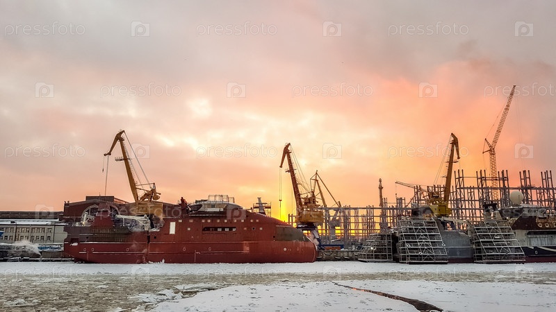 Россия, Санкт-Петербург, декабрь 2021 г.: Красивый закат в порту и корабли у причалов