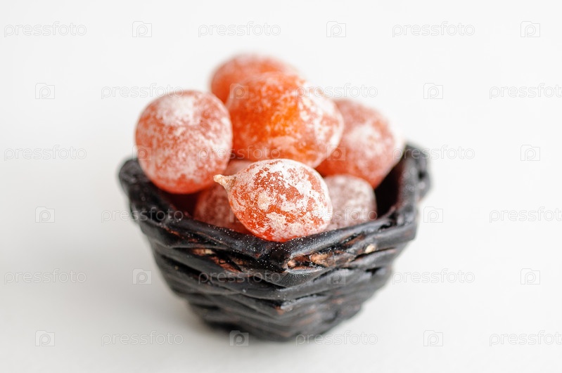 Сушеный кумкват в сахаре в корзине на белом фоне