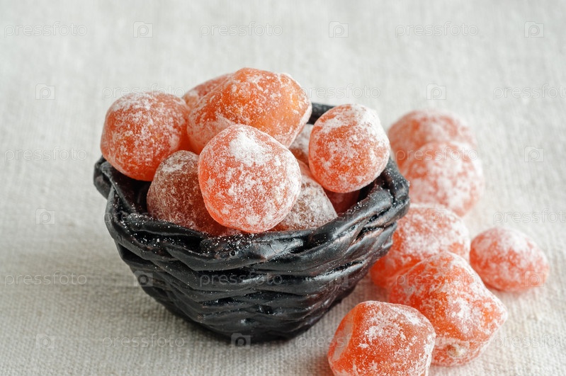 Сушеный кумкват в сахаре в корзине на белом фоне
