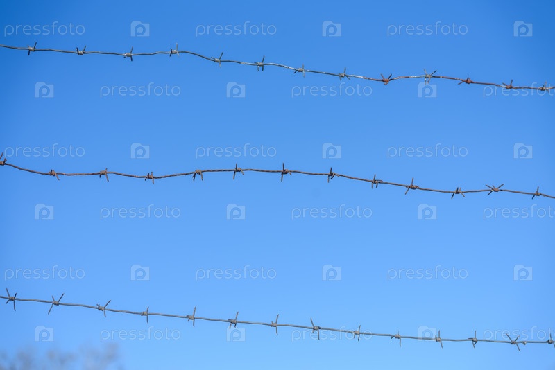 Линии колючей проволоки на фоне голубого неба