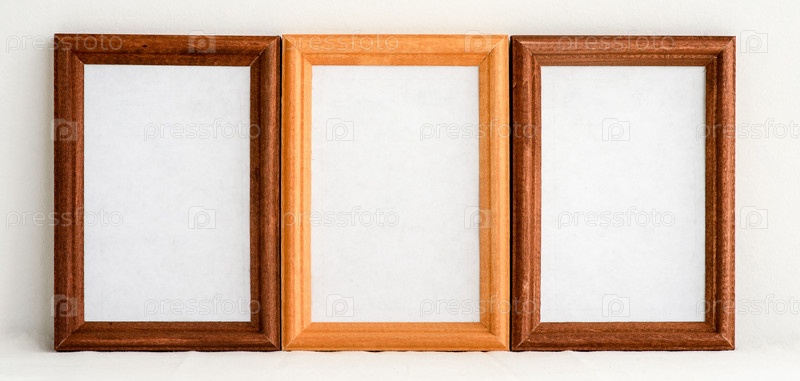 Три деревянные вертикальные рамки с белой пустой карточкой на белом фоне стены. Макет шаблона для вашего дизайна, текст