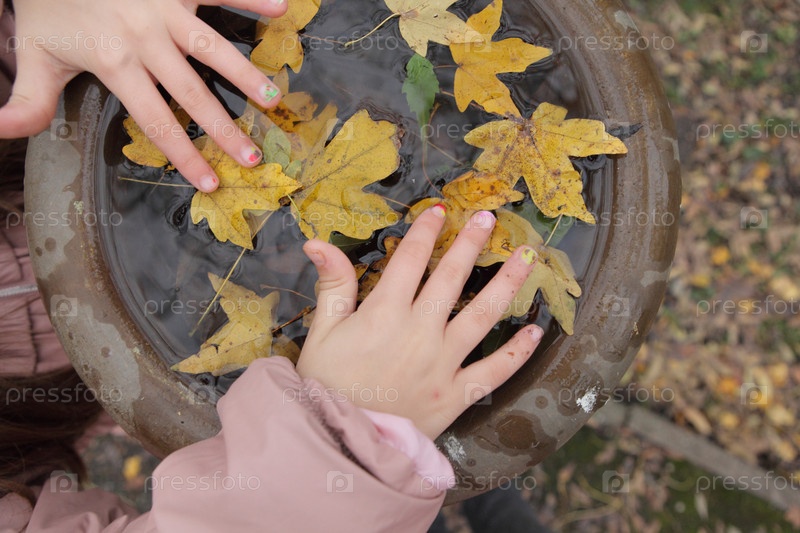 Детские руки и опавшие листья