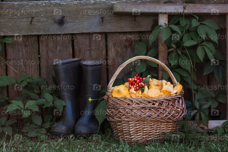 Благородные, съедобные грибы лисички. Красивая плетеная корзина с грибами и резиновые сапоги на даче. Деревенский натюрморт. Сбор грибов