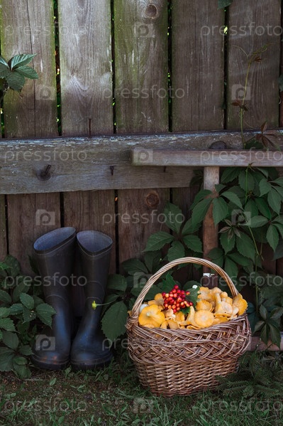 Благородные, съедобные грибы лисички. Красивая плетеная корзина с грибами и резиновые сапоги на даче. Деревенский натюрморт. Сбор грибов