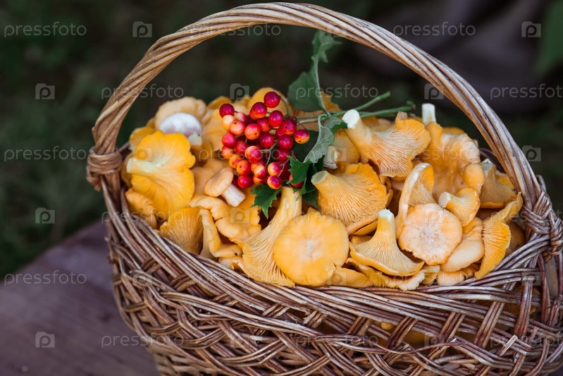 Благородные, съедобные грибы лисички. Красивая плетеная корзина с грибами и резиновые сапоги на даче. Деревенский натюрморт. Сбор грибов