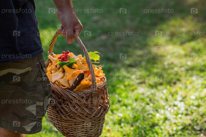 Благородные, съедобные грибы лисички. Грибник собирает лисички в березовом лесу. Красивая плетеная корзина с грибами в руках мужчины