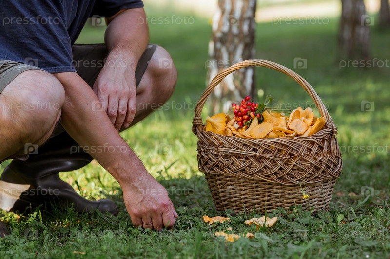 Благородные, съедобные грибы лисички. Грибник собирает лисички в березовом лесу. Красивая текстура фона природы на рассвете
