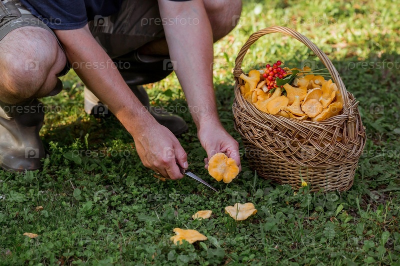 Благородные, съедобные грибы лисички. Грибник собирает лисички в березовом лесу. Красивая текстура фона природы на рассвете