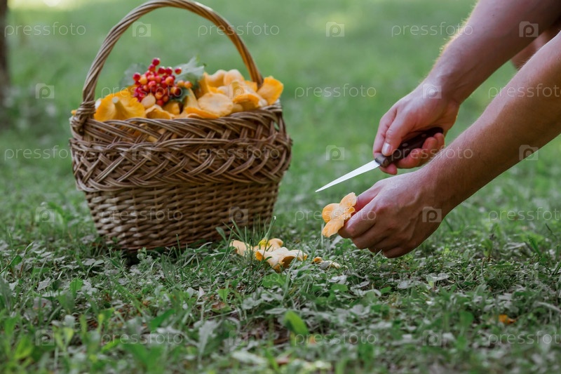 Благородные, съедобные грибы лисички. Грибник собирает лисички в березовом лесу. Красивая текстура фона природы на рассвете