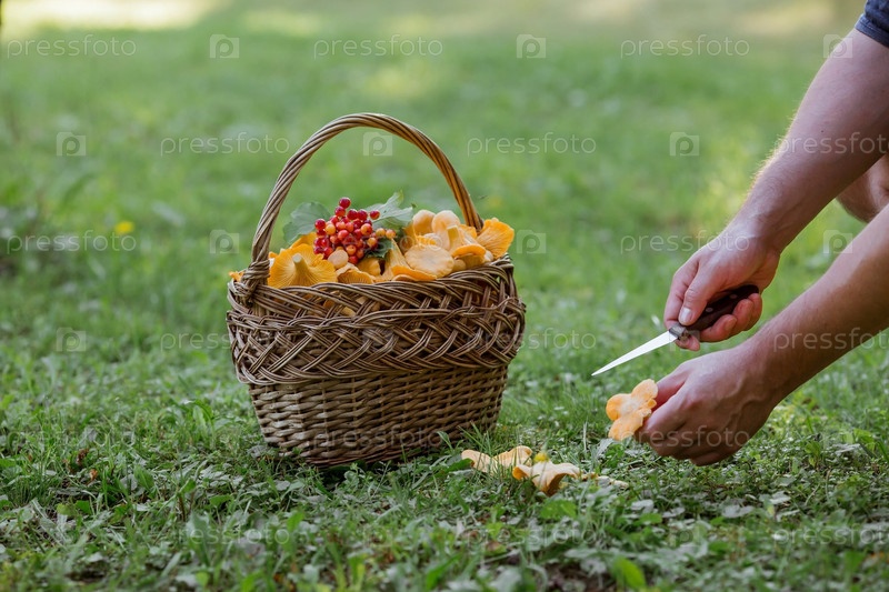 Благородные, съедобные грибы лисички. Грибник собирает лисички в березовом лесу. Красивая текстура фона природы на рассвете
