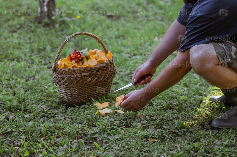 Благородные, съедобные грибы лисички. Грибник собирает лисички в березовом лесу. Красивая текстура фона природы на рассвете