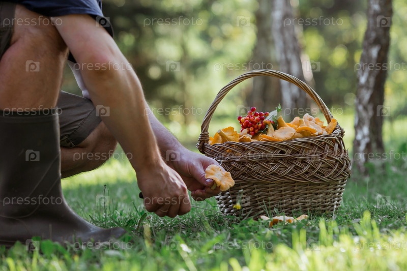 Благородные, съедобные грибы лисички. Грибник собирает лисички в березовом лесу. Красивая текстура фона природы на рассвете