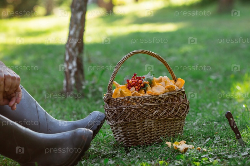 Благородные, съедобные грибы лисички. Желтые лисички в красивой плетеной корзине в березовом лесу. Красивая текстура природного фона