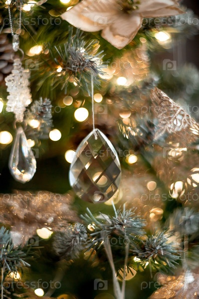 Стильные стеклянные хрустальные прозрачные игрушки на елку. Бежевые тона. Баннер для дизайна веб-страницы. Концепция стильного Нового года и Рождества 2024