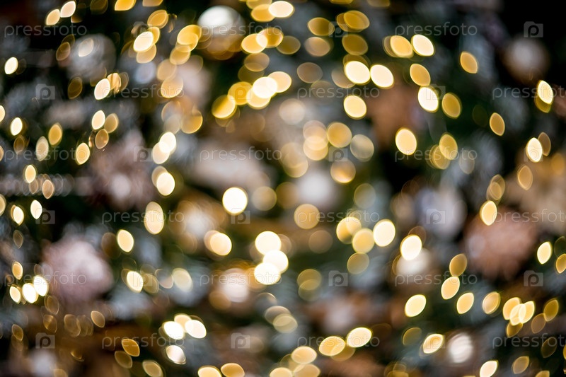 Абстрактный размытый свет боке на рождественской елке с теплым оттенком желтого и зеленого. Красивый новогодний фон 2023