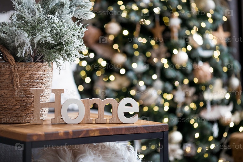 Красивая праздничная открытка. Концепция счастливого Нового года и Рождества 2024 года. Рождественские елки и домашний знак на деревянном столе в уютной гостиной