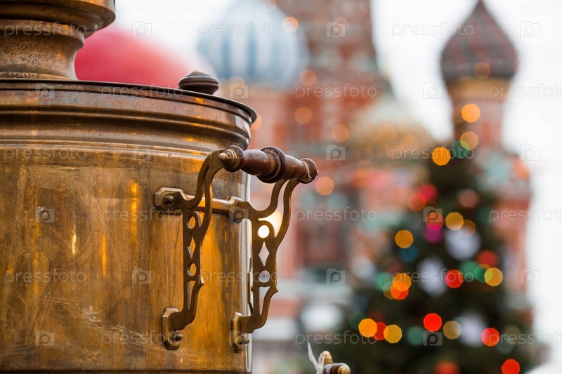 Рождественское украшение Красной площади. Красивые праздничные украшения в городе. Большой самовар в центре города. Москва, Красная площадь, декабрь 2023 г