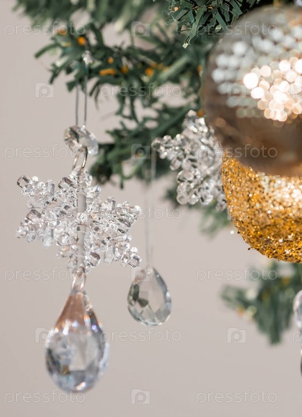Стильные золотые и кристально чистые игрушки на елке. Бежевые тона. Концепция оформления интерьера и стильный Новый год и Рождество 2024