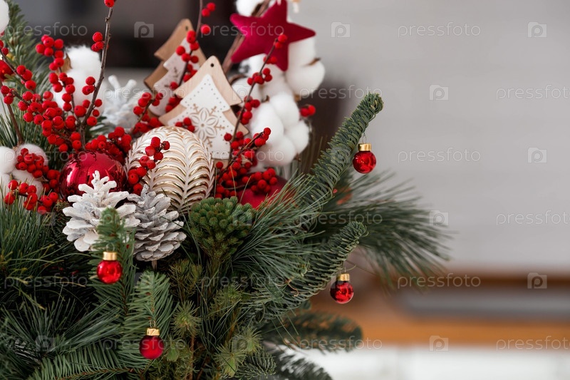 Еловый букет с красными ягодами, игрушками и хлопковым крупным планом. Новогодние украшения в интерьере. Концепция подготовки к новогодним праздникам 2024 года