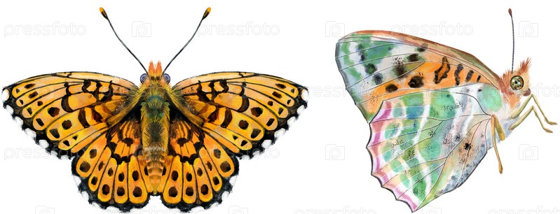 Бабочка-рябчик с жемчужной каймой. Вид сверху и сбоку. Акварельная иллюстрация
