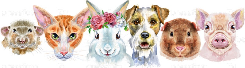 Граница из акварельных портретов собаки, морской свинки, кошки, мини-свиньи, кролика и крысы