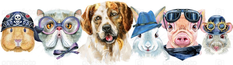 Граница из акварельных портретов собаки, морской свинки, кошки, мини-свиньи, кролика и крысы