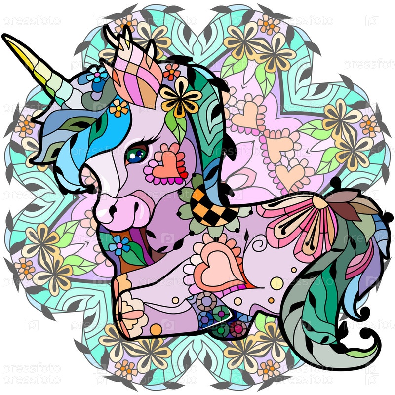 Единорог в стиле зентангл на мандале. Может использоваться для печати на футболках, обоях или плакатах