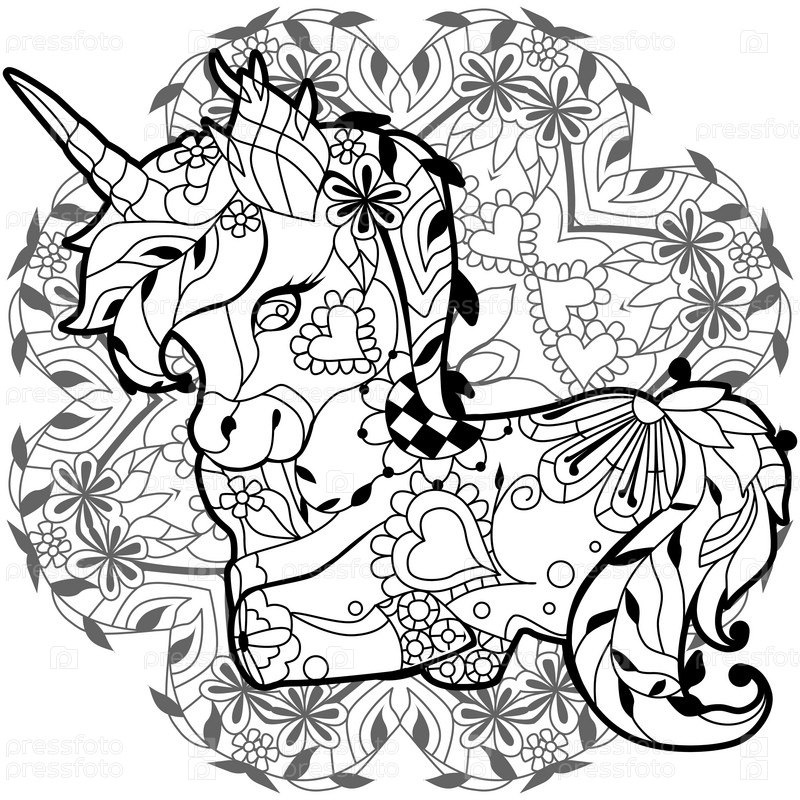 Милый мультяшный единорог на мандале. Фантастическое животное. Черно-белое, линейное изображение. Для оформления принтов, плакатов, наклеек, татуировок