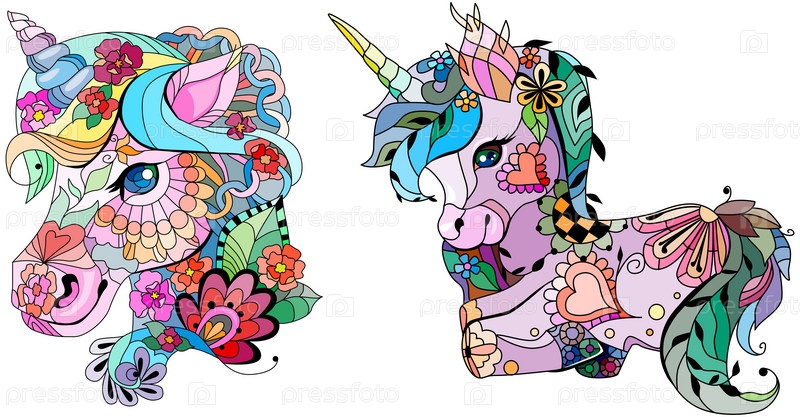 Набор милых мультяшных единорогов. Фантастическое животное. Для оформления принтов, плакатов, наклеек, татуировок
