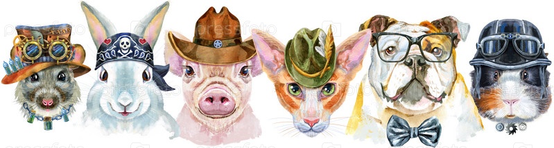 Граница из акварельных портретов собаки, морской свинки, кошки, мини-свиньи, кролика и крысы