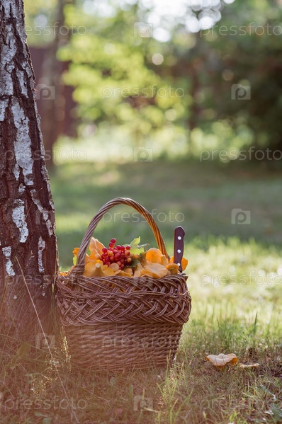 Благородные, съедобные грибы лисички. Желтые лисички в красивой плетеной корзине в березовом лесу. Красивая текстура природного фона