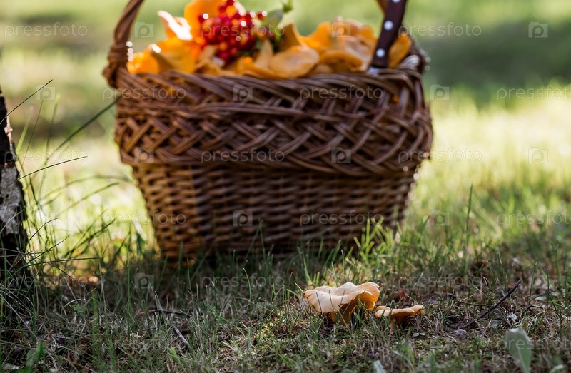 Благородные, съедобные грибы лисички. Желтые лисички в красивой плетеной корзине в березовом лесу. Красивая текстура природного фона