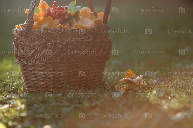 Благородные, съедобные грибы лисички. Желтые лисички в красивой плетеной корзине в березовом лесу. Красивая текстура природного фона