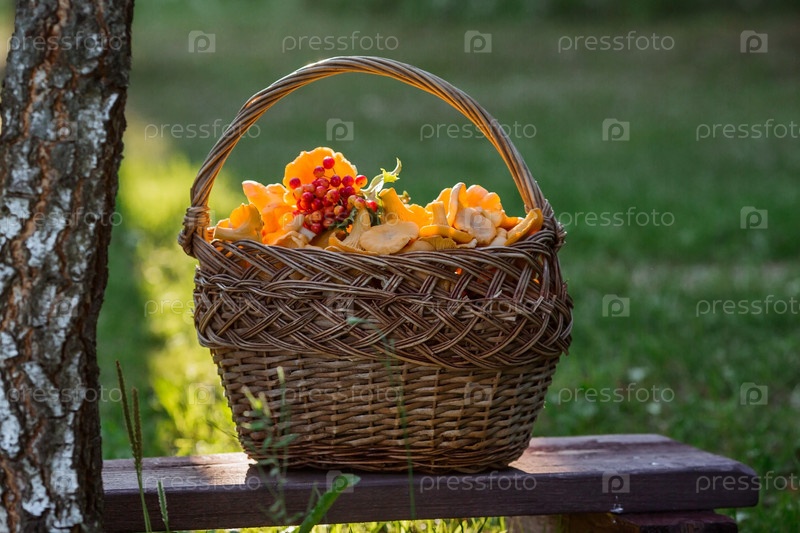 Благородные, съедобные грибы лисички. Желтые лисички в красивой плетеной корзине в березовом лесу. Красивая текстура природного фона
