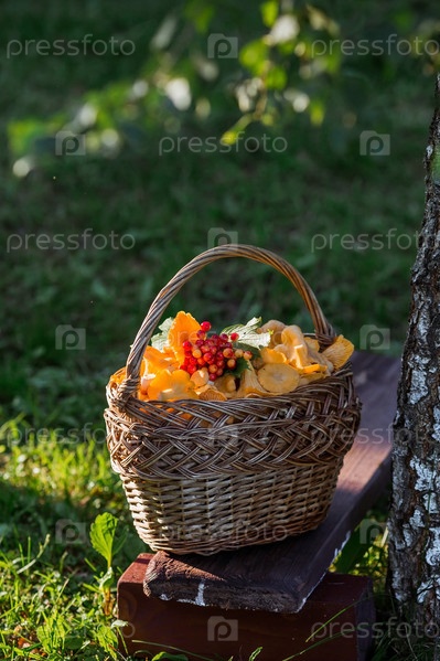 Благородные, съедобные грибы лисички. Желтые лисички в красивой плетеной корзине в березовом лесу. Красивая текстура природного фона
