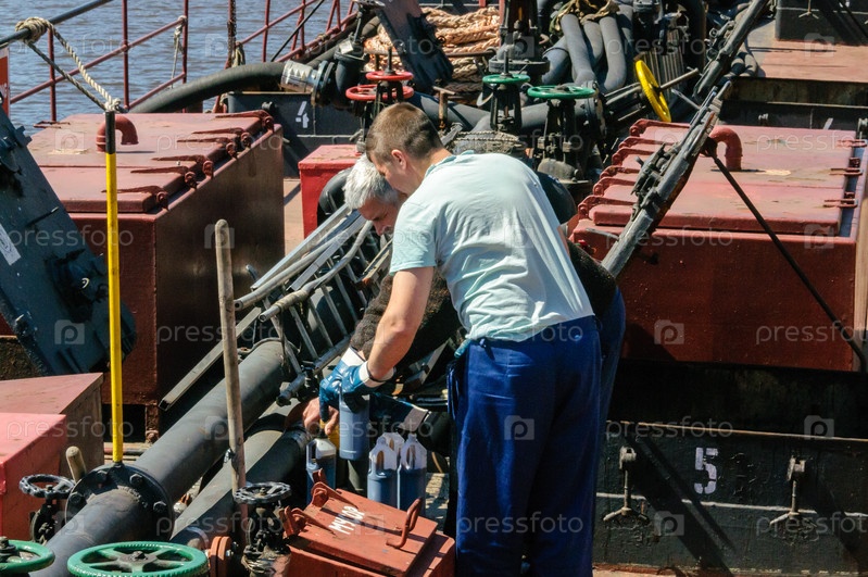Россия, Санкт-Петербург, май 2021 г.: Два моряка-мужчины работают на палубе нефтяного танкера