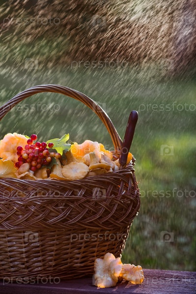 Благородные, съедобные грибы лисички. Желтые лисички в красивой плетеной корзине в березовом лесу под дождем. Красивая текстура природного фона