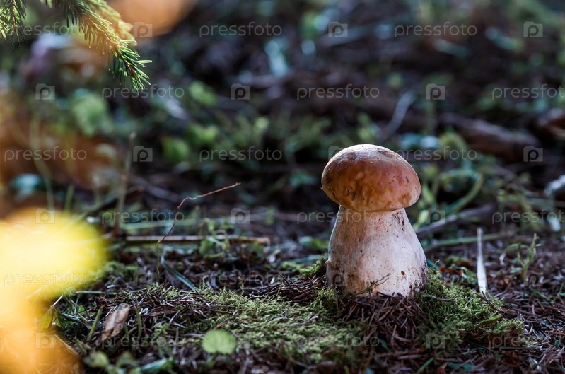 Благородный, королевский гриб. Подберезовики белые. Белые грибы в еловом лесу. Красивая текстура природного фона