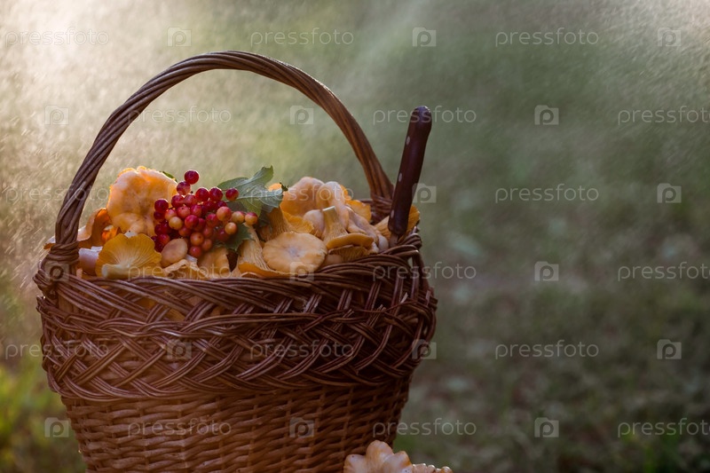 Благородные, съедобные грибы лисички. Желтые лисички в красивой плетеной корзине в березовом лесу под дождем. Красивая текстура природного фона
