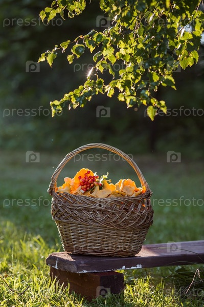 Благородные, съедобные грибы лисички. Желтые лисички в красивой плетеной корзине в березовом лесу. Красивая текстура природного фона