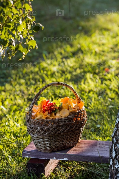 Благородные, съедобные грибы лисички. Желтые лисички в красивой плетеной корзине в березовом лесу. Красивая текстура природного фона