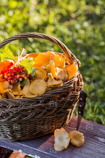 Благородные, съедобные грибы лисички. Желтые лисички в красивой плетеной корзине в березовом лесу. Красивая текстура природного фона