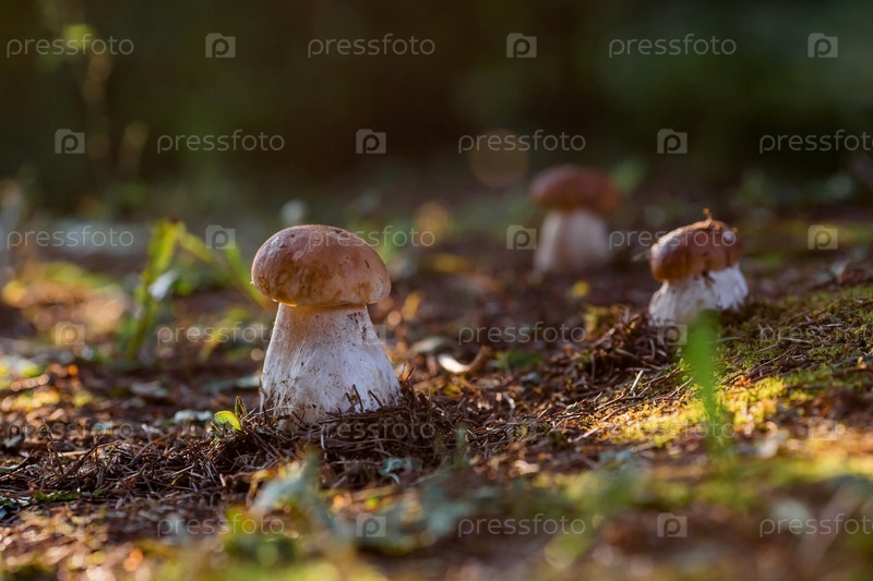 Благородный, королевский гриб. Подберезовики белые. Белые грибы в еловом лесу. Красивая текстура природного фона