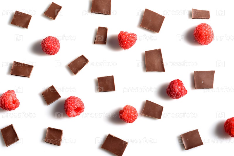 Кусочки шоколада и ягод на белом фоне, вид сверху