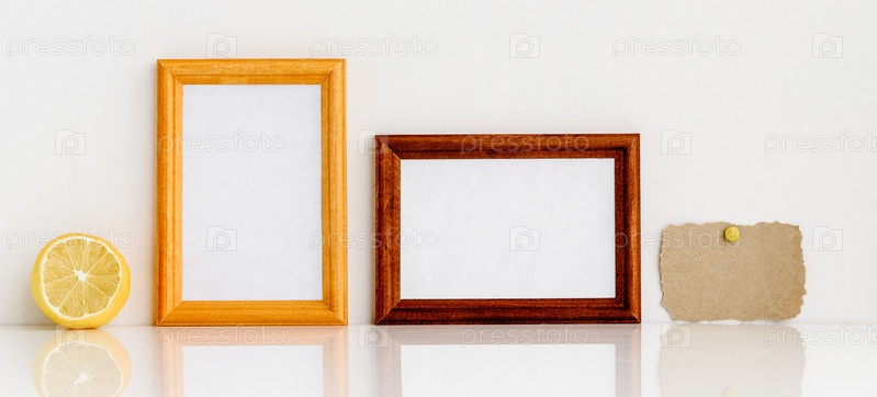 Две деревянные рамки с белой вставкой внутри, лимоном и кусочком крафт-бумаги