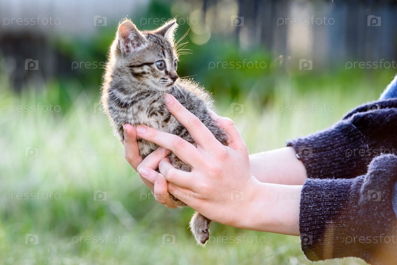 Маленький очаровательный котенок в руках девочки на фоне зеленой лужайки