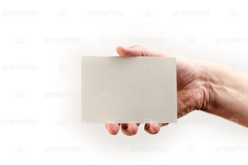 Белая пустая карточка в руке мужчины на белом фоне. Заготовка для дизайнерской надписи